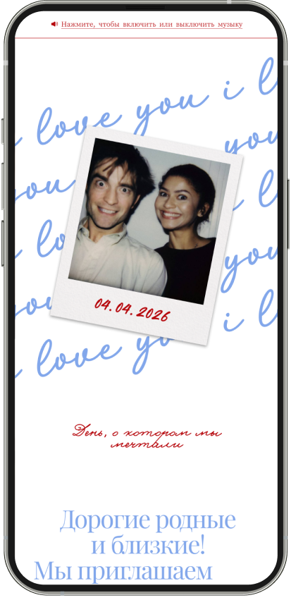 Это персональная страница вашего события, которая заменяет или эстетично дополняет бумажную полиграфию. Здесь собрано всё важное: от тайминга до анкеты для гостей. Ссылку на пригласительное легко отправить в мессенджере, и она всегда будет под рукой у ваших близких в их смартфонах.